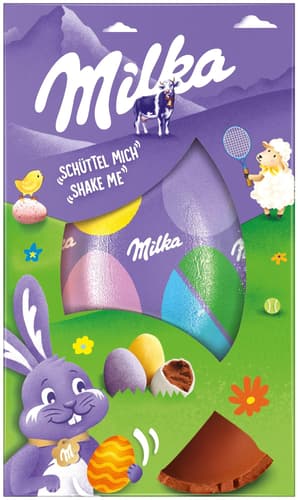 Vajíčko z mléčné čokolády z alpského mléka uvnitř s vajíčky (22,5 %) z mléčné čokolády z alpského mléka v cukrové polevě. Ideální jako malá velikonoční pozornost, do výslužky i pro chvíle mlsání.