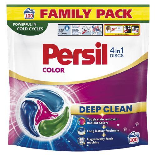 Persil Deep Clean 4v1 Discs Color kapsle na praní pro hloubkově čisté prádlo a hygienicky svěží pračku. Složení kapslí proniká hluboko do vláken vašeho oblečení a zanechá prádlo dokonale čisté, poté působí hluboko uvnitř mechanismu pračky a odstraní nečistoty, které mohou způsobovat nepříjemný zápach. Nové kompaktované prací kapsle zajišťují vynikající čisticí účinek s menším dopadem na životní prostředí díky nižší spotřebě materiálu.