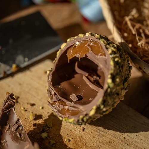 Čokoládovna Janek Mléčné vajíčko plněné karamelem obalené v pistácii