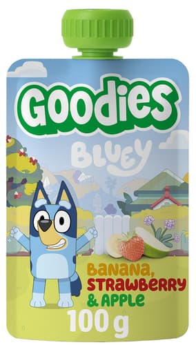 Ovocná kapsička Goodies Bluey s příchutí banánu, jahody a jablka je ideální svačinka pro děti od 3 let. Obsahuje 100 % ovoce bez přidaného cukru*, škrobů a zahušťovadel. Praktické balení je vhodné na cesty, na hřiště nebo do svačinového boxu. Přirozeně sladká chuť pochází pouze z ovoce.