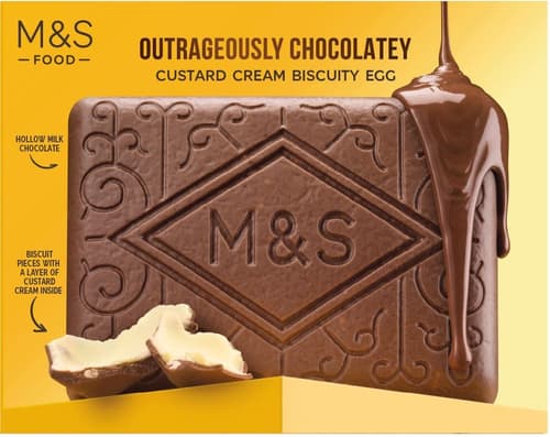 320 gVelikonoční vajíčko od Marks & Spencer je vyrobeno z mléčné čokolády s křupavými kousky sušenek. Uvnitř se nachází vrstva bílé čokolády s vanilkovou příchutí a krémová náplň.
