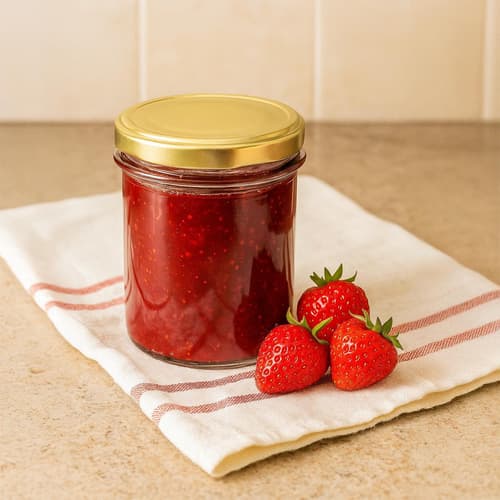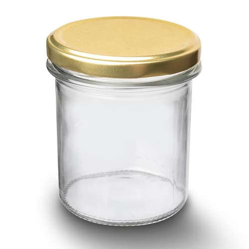 Průhledná sklenice se zlatým kovovým víčkem bude vaším pomocníkem při zavařování a dlouho uchová jakýkoliv džem či kompot.