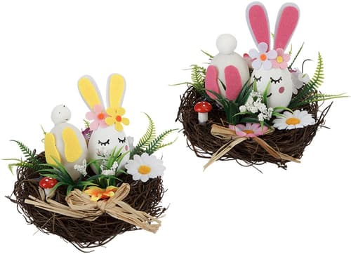 Velikonoční dekorace PMS Velikonoční zajíček v hnízdě přináší jarní atmosféru do vašeho interiéru. Zajíček je usazen v přírodně laděném hnízdě, které je doplněno veselými barvami a květinovými detaily. Ideální doplněk pro velikonoční výzdobu nebo jako drobný sezónní dárek.