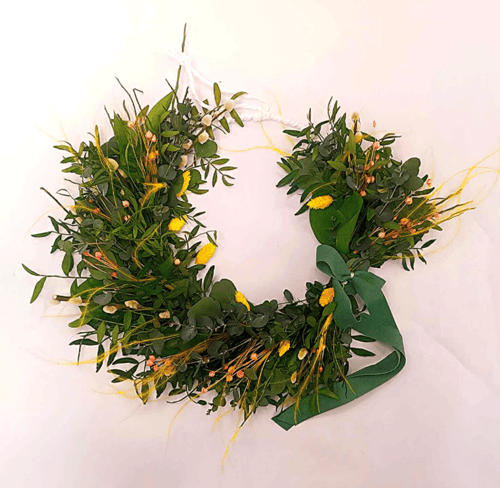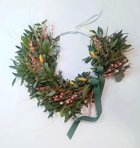 Zdobený kruh s přírodními a sušenými rostlinami, který vykouzlí krásnou atmosféru u vás doma. Také se skvěle hodí jako dárek.