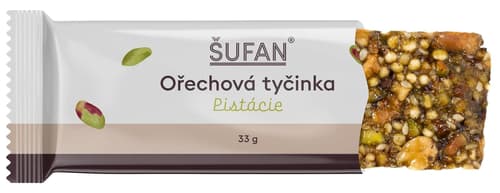 Pistáciová ořechová tyčinka od výrobce Šufan je výživná a chuťově vyvážená svačina z poctivých surovin – pistácií, sezamu, pufované quinoi a kapky čekankového sirupu. Jemně opražené ořechy doplňuje BIO třtinový cukr a špetka Matcha čaje pro lehké povzbuzení. Vegan, bez lepku a bez zbytečných přísad. Ideální do batohu, kabelky i do práce jako rychlý zdroj energie a dobré nálady.