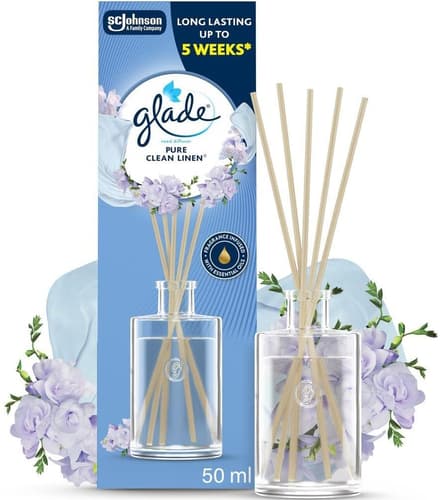 Glade vonné tyčinky Pure Clean Linen přinášejí dlouhotrvající vůni až po dobu 5 týdnů. Obsahují esenciální oleje přírodního původu, které neobsahují parabeny, ftaláty ani přidaná barviva. Tyčinky jsou vyrobeny z přírodního ratanu. Vhodné pro použití v každé místnosti v domácnosti. Obal je vyroben ze 100 % recyklovaného papíru, což přispívá k udržitelnosti.