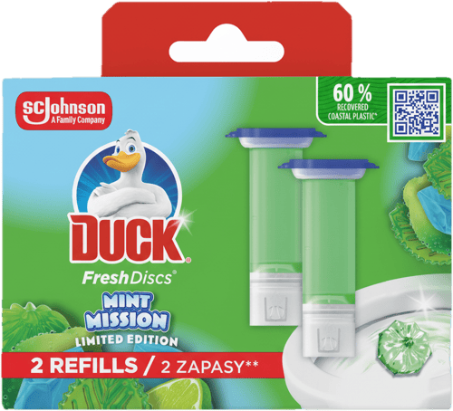 Holandsko,Duck Fresh Discs Mint Mission duonáplň s limitovanou vůní je čistič určený pro čištění toalety při každém spláchnutí. Zabraňuje usazování vodního kamene a dlouhodobě osvěžuje vůní levandule. Balení obsahuje dvě náhradní náplně, aplikátor není součástí balení.