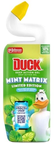 Duck tekutý gel Mint Matrix je WC čistič s limitovanou vůní máty. Díky speciálnímu tvaru lahve se snadno aplikuje i pod okraj WC mísy, kde účinně odstraňuje vodní kámen, skvrny a nečistoty. Pravidelné používání pomáhá předcházet usazování vodního kamene a zajišťuje dlouhodobou čistotu a svěžest toalety. Obal obsahuje 50 % recyklovaného plastu.