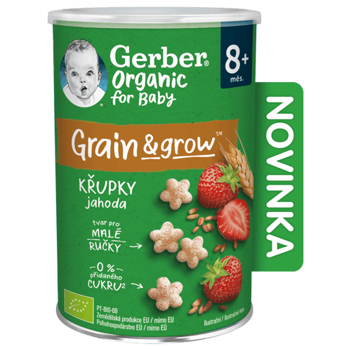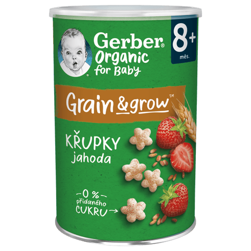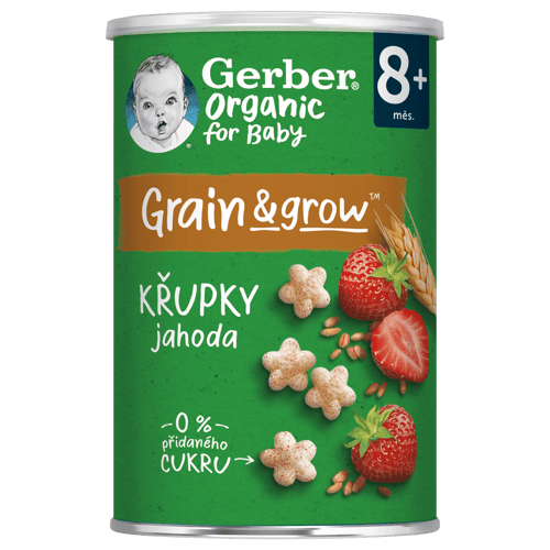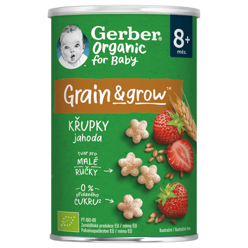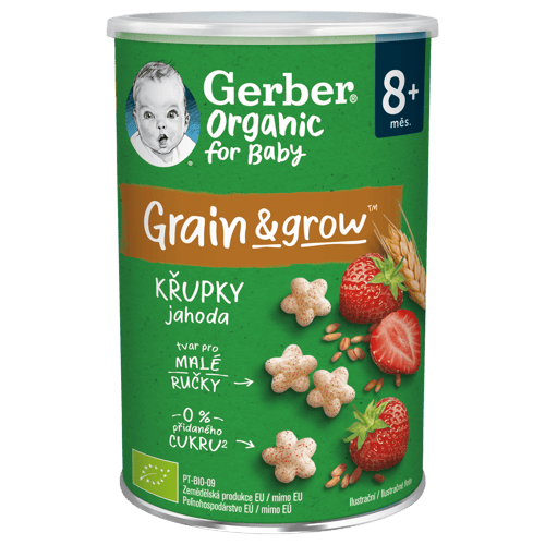 Jahodové křupky Gerber Organic jsou křehkou a nadýchanou svačinkou pro malé děti od ukončeného 8. měsíce. Každá křupka obsahuje kombinaci obilovin a banánu pěstovaných na certifikovaných organických farmách, kde se bere ohled na přirozený způsob pěstování a dozrávání všech plodin. Grain&Grow přináší do ručky vašeho děťátka to nejlepší ze světa obilovin a výživy.