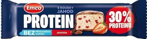Emco proteinová tyčinka s jahodovou příchutí má 30 % proteinu a je bez přidaného cukru. Měkký základ doplňují kousky mrazem sušených jahod.