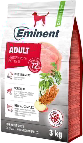 Česká republika,Eminent Adult je kompletní a vyvážené krmivo pro psy, vytvořené na základě dlouholetých zkušeností a moderních poznatků v oblasti výživy. Obsahuje pečlivě vybírané suroviny, které podporují dobré zdraví a kondici.