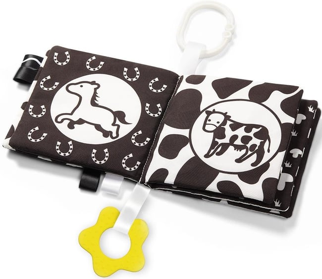 Čína,Černobílá senzorická kniha Babyono je navržena pro podporu smyslového vývoje dětí. Obsahuje vysoce kontrastní obrázky, různé textury a zvuky, které stimulují zrak, sluch a hmat. Kniha pomáhá rozvíjet motorické dovednosti a fantazii dítěte. Snadno ji zavěsíte na postýlku, kočárek nebo autosedačku. Ideální pro první fáze vývoje dítěte.