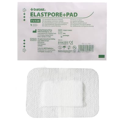 Zdravotnický prostředek. ELASTPORE+PAD je elastická sterilní náplast na rány s absorpčním polštářkem. Klíčové vlastnosti: Aplikovatelná na oblých a kónických částech těla. Savý polštářek má vysokou absorpční schopnost a je opatřen povrchovou vrstvou zabraňující přilepení na ránu. Netkaný textil náplasti je propustný pro vzduch a vodní páru. Velikost náplasti je 7 cm x 5 cm. Balení obsahuje 1 ks.