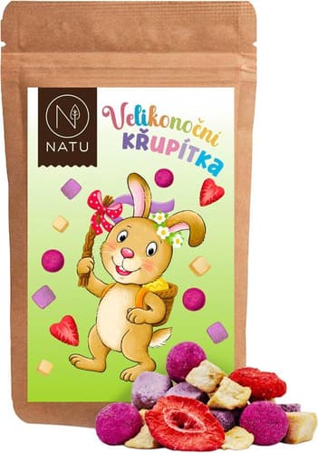 Objevte barevnou nadílku plnou chutí – Velikonoční křupítka. Uvnitř najdete ty nejkřupavější kousky ovoce a dračí čokoládová vajíčka. Koledníci si pochutnají na mrazem sušených jahodách a jablíčkách, které se na jazyku rozplynou jako první jarní sluneční paprsky. Kouzelné borůvkové čtverečky s kokosovým mlékem vyčarují krémovou, lehce tropickou chuť. A nakonec opravdový poklad – křupavé lískové oříšky v bílé čokoládě poprášené prachem z dračího ovoce. Hravý mix plný barev a sladkých překvapení udělá radost malým i velkým dětem.