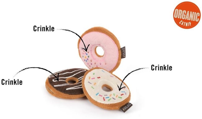 Hračky pro kočky P.L.A.Y. Donuts jsou ekologické, interaktivní a obsahují BIO šantu kočičí, která je pro kočky neodolatelná. Výplň hraček je vyrobena z recyklovaného plastu a splňuje bezpečnostní standardy pro dětské hračky.