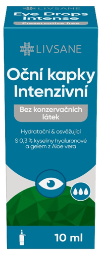 Zdravotnický prostředek. LIVSANE Oční kapky představují intenzivně hydratační a lubrikační oční roztok s osvěžujícím účinkem, obsahující 0,3 % kyseliny hyaluronové a gel z Aloe vera. Díky sterilnímu složení bez konzervačních látek jsou vhodné i pro citlivé oči a lze je bezpečně používat společně s kontaktními čočkami. Indikace: Poskytují lubrikaci, hydrataci a osvěžení suchých a unavených očí. Ideální v případě netraumatických/nepatologických změn slzného filmu. Při zátěži očí způsobených faktory prostředí (nadměrné vystavení slunečnímu záření, vítr, prach, klimatizace, suchý a znečištěný vzduch atd.). Při zátěži očí (dlouhodobé používání počítače, nepříznivé světelné podmínky, noční jízda atd.). Vhodné při dlouhodobém používání kontaktních čoček; lze používat i přímo s nasazenými čočkami. Balení obsahuje 10 ml.