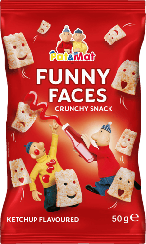 Pat a Mat Funny Faces kečup jsou křupavé snacky s jemnější texturou a výraznou kečupovou chutí. Hodí se pro rychlé občerstvení doma i na cestách. Snacky jsou připravovány na kvalitním slunečnicovém oleji, který přispívá k čistší chuti.