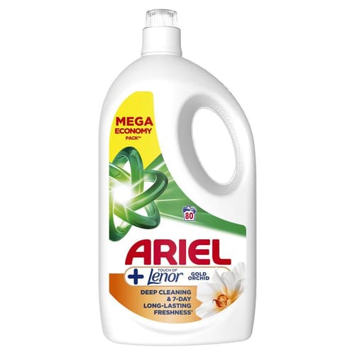 Francie,Tekutý prací prostředek Ariel +Touch of Lenor Gold Orchid je určen pro hloubkové čištění a dlouhotrvající svěžest až po dobu 7 dnů při uložení ve skříni. Poskytuje efektivní výsledky i při praní na nižších teplotách. Pro maximální účinnost lze prostředek nanést pomocí zelené odměrky přímo na skvrny před praním.