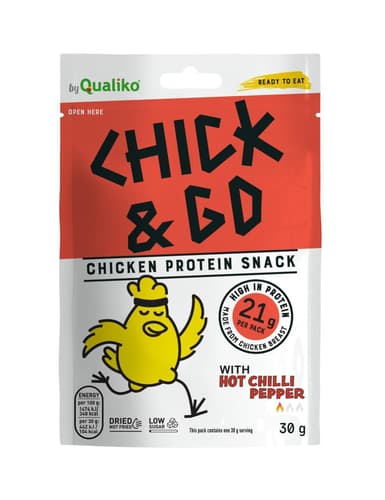Ochutnejte pikantní sušené kuřecí plátky s chilli od Chick&Go! Tyto proteinové jerky plátky z EU s výraznou, kořeněnou chutí jsou ideální jako rychlá svačinka na cesty nebo pro dochucení sendvičů a salátů. Balení po 30g je praktické a plátky jsou připravené k okamžité konzumaci, takže si je můžete vychutnat kdykoli a kdekoli.