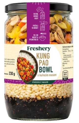 Slovenská republika,Směs na Kung Pao s kuřecím masem značky Freshery. V každé porci objevíte harmonické spojení jemného kuřecího masa, rýže a omáčky. Pokrm je balený ve sklenici.