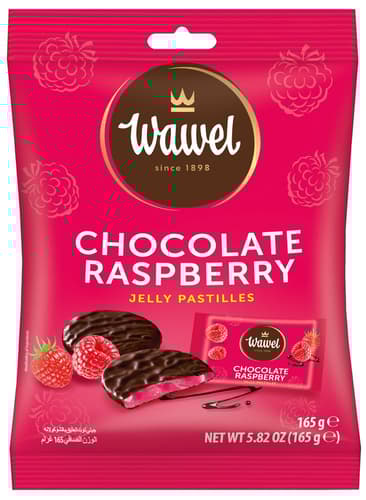 Želé bonbony značky Wawel s příchutí maliny obalené čokoládou. Čokoláda kromě kakaového másla obsahuje rostlinné tuky.