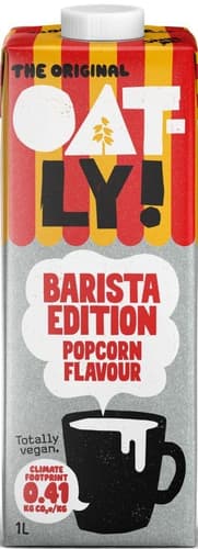 Ovesný nápoj Barista s příchutí popcornu Oatly! je rostlinná alternativa mléka určená pro přípravu kávy. Má krémovou konzistenci a dobře se šlehá do hladké pěny. Příchuť popcornu přidává lehce sladký, karamelově pražený tón, který doplní cappuccino i latte. Vhodné pro vegany.