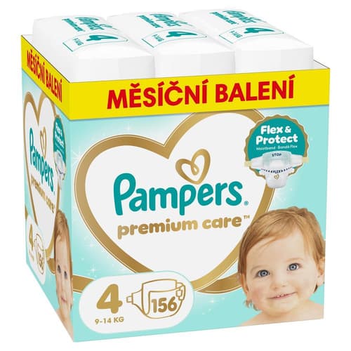 Jednorázové plenky Pampers Premium Care s hebkou povrchovou vrstvou pro děti o hmotnosti 9-14 kg.