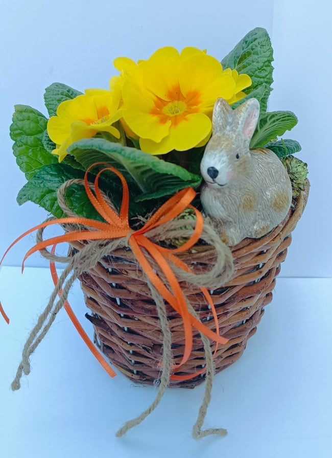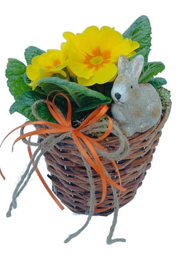 Česká republika,Jarní aranžmá v proutěném košíčku s primulkou. Dekoraci doplňuje keramický zajíček, šišky a stuha.