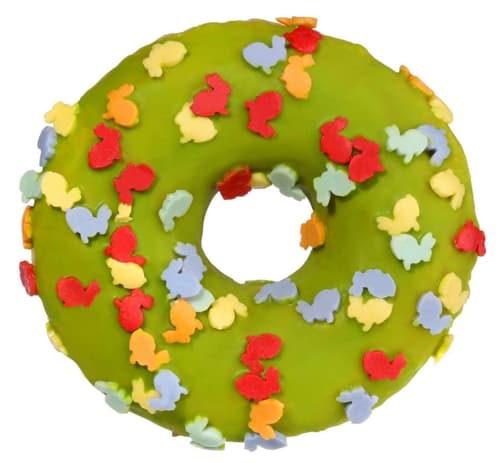 Česká republika,Sladký donut vyrobený z jemného kynutého těsta. Na povrchu je přelitý zelenou tukovou polevou a posypaný dekorací ve tvaru zajíčků.