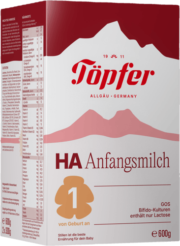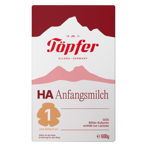Německo,Töpfer HA Počáteční mléčná kojenecká výživa 1 je mléčná výživa v prášku vhodná od narození. Lze ji používat jako jediný zdroj výživy, pokud kojení není možné, nebo jako doplněk. Receptura je vyvíjena s pečlivostí, která je pro Töpfer typická – s důrazem na vyvážené složení a praktickou každodenní přípravu. Značka vyrůstá z tradice regionu Allgäu v Německu, kde se opírá o dlouholeté zkušenosti a stálé nároky na kvalitu.