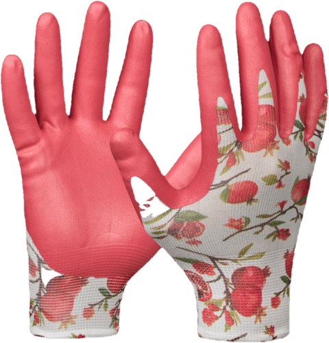 Pracovní rukavice GARDELUXE s potiskem granátových jablek jsou určené pro běžné práce v dílně i na zahradě. Jsou vyrobené z pružného a prodyšného polyesterového úpletu, při výrobě byly použity recyklované PET lahve.
