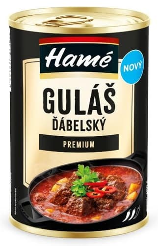 Hamé ďábelský guláš je sterilované hotové jídlo v konzervě, vhodné jako rychlé řešení oběda nebo večeře.