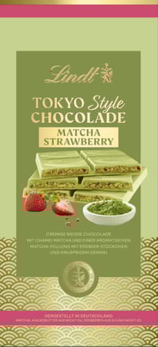 Německo,Jemná bílá čokoláda Lindt s pravou matchou, jahodami a praženou rýží Genmai. Kombinace sladké čokolády, lehce nahořklé matchy a ovocných tónů jahod doplňuje jemná křupavost rýže. Náplň s mandlemi, jahodami a matchou dodává čokoládě plnější chuť a vyvážený profil. Limitovaná edice inspirovaná japonskými příchutěmi.