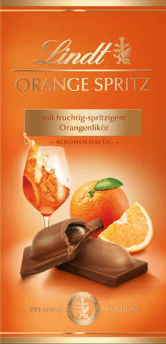 Německo,Lindt Orange Spritz je jemná mléčná čokoláda s osvěžující náplní inspirovanou pomerančovým likérem. V chuti se propojuje sladkost čokolády s citrusovým tónem a ovocnou svěžestí.
