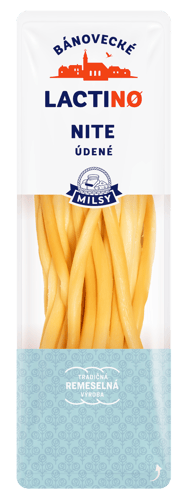 Bánovecké sýrové nitě s uzeným aromatem značky Milsy. Jde o pařený, nezrající, poloměkký a polotučný sýr vhodný pro každodenní použití.