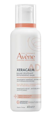 AVENE XeraCalm A.D. relipidační balzám je ideální pro velmi suchou až atopickou pokožku se sklonem ke svědění. Díky patentované složce I-Modulia a komplexu Lipid: B2 pomáhá obnovit kožní bariéru a rovnováhu mikrobiomu, okamžitě zklidňuje a snižuje riziko recidivy suchosti až na 6 měsíců. Je bez parfemace, nekomedogenní a vhodný pro novorozence, děti i dospělé, včetně těhotných. Balení 400 ml.