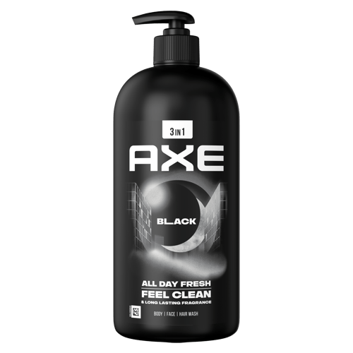 Axe sprchový gel Black nabízí elegantní vůni s nádechem šťavnatého ovoce a dřevitých tónů, která vydrží až 12 hodin. Složení obsahuje 100% přírodní prebiotika a je bez parabenů. Pomáhá omezovat bakterie způsobující zápach, má 5 × více hydratačních složek a je dermatologicky testován.