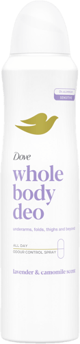 Dove Whole Body Deo Sprej levandule & heřmánek je deodorant ve spreji určený na celé tělo. Vhodný pro podpaží, hrudník, nohy a další citlivé oblasti. Složení bez hliníku je dermatologicky testované a vhodné i pro citlivou pokožku. Pomáhá omezit tělesný zápach, rychle zasychá a nezanechává zbytky.