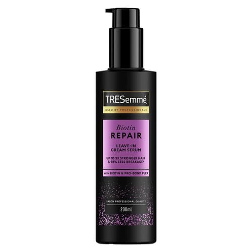 TRESemmé Biotin Repair leave-in krémové sérum na vlasy je bezoplachová péče pro uhlazení délek a konečků a omezení krepatění. Pomáhá zanechat vlasy hladší a lépe upravitelné. S biotinem a technologií Pro-Bond Plex podporuje pevnější vzhled vlasů a snižuje lámání při stylingu. Obsahuje UV filtr a je vhodné jako krok před fénováním a běžnou úpravou účesu.