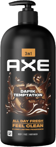 Axe sprchový gel Dark Temptation pro muže s vůní červeného pepře a jantaru s čokoládovým tónem, která může přetrvat až 12 hodin. Složení obsahuje 100% přírodní prebiotika pro pocit svěžesti, 5 × více hydratačních složek a je bez parabenů. Gel pokožku důkladně čistí, pomáhá ji udržet svěží a je dermatologicky testován.