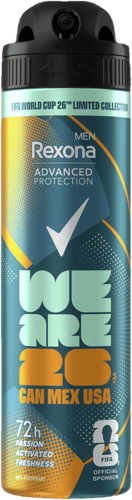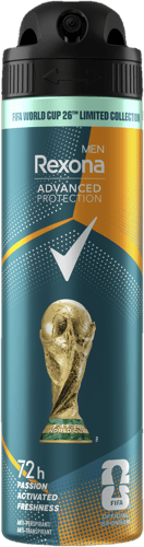 Velká Británie,Rexona Men Advanced Protection FIFA 2026 Limitovaná Edice je antiperspirant ve spreji pro každodenní použití. Poskytuje ochranu proti pocení a zápachu a zanechává svěží mužnou vůni. Limitovaná edice je inspirovaná FIFA World Cup 2026™ a přináší tři různé designy obalu (WE ARE 2026, FIFA Trophy, THE FINAL). Obsah produktu je u všech variant stejný – liší se pouze vzhledem balení.