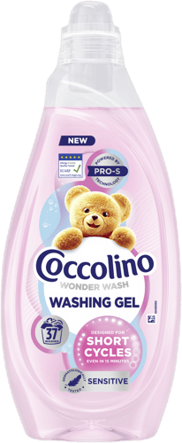 Maďarsko,Prací gel Coccolino Wonder Wash Sensitive je určen pro běžné praní prádla se šetrnějším přístupem k textiliím. Balení 1,48 l vystačí až na 37 praní. Gel je vhodný pro pravidelné praní různých typů prádla a lze jej dávkovat podle znečištění a tvrdosti vody.