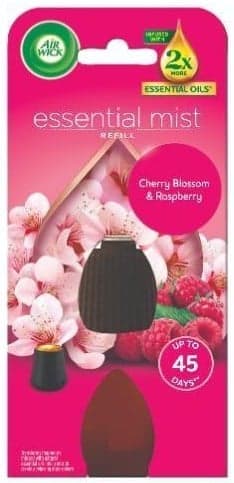 Maďarsko,Náplň Air Wick pro aroma difuzér Essential Mist s vůní třešňového květu a maliny je připravená k okamžitému použití. Nepotřebuje vodu a je určená k provonění interiéru. Vůně je obohacena o dvojnásobné množství přírodních esenciálních olejů oproti předchozímu složení náplní Air Wick. Neobsahuje aceton ani ftaláty.