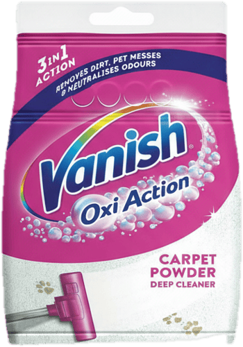 Vanish Oxi Action prášek na čištění koberců pomáhá odstranit špínu a zachytit chlupy z domácnosti. Je vhodný pro koberce i čalounění a je bezpečný pro různé barvy a materiály. Prášek čistí nepořádky po domácích mazlíčcích a pomáhá neutralizovat zápach ze zvířecí moči a výkalů, mokrého psa, plísně i vaření.