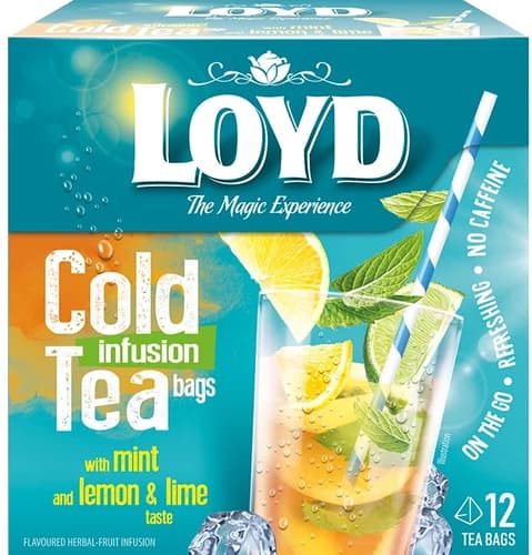 Porcovaný bylinno-ovocný čaj Loyd v pyramidových sáčcích je aromatizovaný příchutí citrónu a limetky s přídavkem máty. Je určený pro přípravu studeného nápoje.