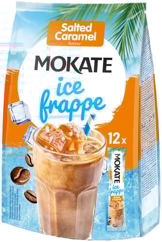 Instantní kávový nápoj v prášku Mokate Ice Frappe s příchutí slaného karamelu je určený pro rychlou přípravu studeného nápoje.