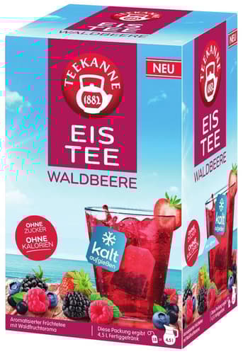 Teekanne Eistee Waldbeere - ovocno-bylinný čaj aromatizovaný, s příchutí lesního ovoce. Lahodný a osvěžující ledový čaj, který byl speciálně vyvinut pro přípravu studenou vodou. Nabízí chladné potěšení z pití bez kalorií a bez cukru.