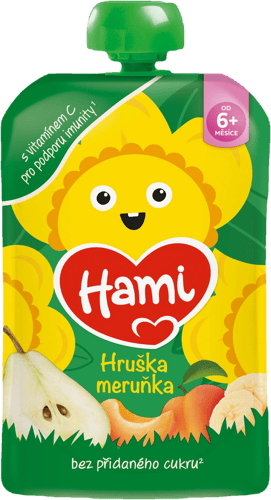 Ovocná kapsička Hami s příchutí jablko, hruška, banán a meruňka je určená pro dětské stravování. Pyré má vysoký obsah vitamínu C, který podporuje správnou funkci imunitního systému. Praktické balení umožňuje podávání doma i na cestách – na lžičku nebo přímo z obalu podle věku a zvyklostí dítěte.