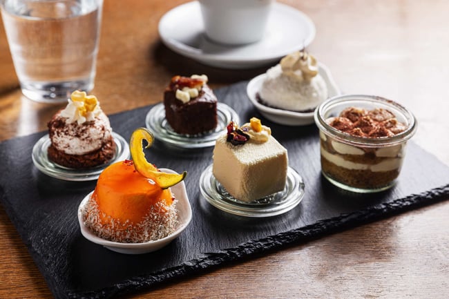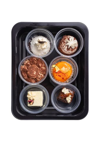 V balení najdete Tiramisu (50 g), Mango mousse (35 g), Stracciatella (25 g), Brownie s datlemi (30 g), Kokosový „Ferrero“ (30 g) a Maracuja dortík s kokosem (30 g).