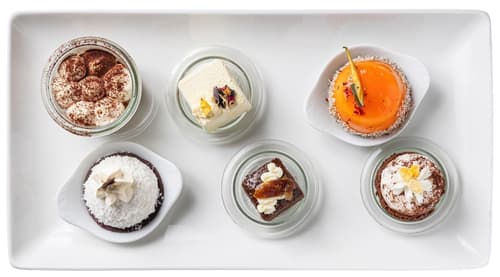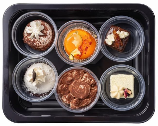 V balení najdete Tiramisu (50 g), Mango mousse (35 g), Stracciatella (25 g), Brownie s datlemi (30 g), Kokosový „Ferrero“ (30 g) a Maracuja dortík s kokosem (30 g).
